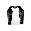 - Cropped, raglan-cut, long sleeved shirt with cotton blend ribbing & silk screen print graphic